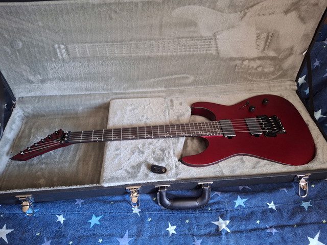 Guitars in the LTD 1000 Series are designed to offer the tone, feel, looks, and quality that working professional musicians need in an instrument. The M-1000 Candy Apple Red Satin is built to shred with neck-thru-body construction, an extra-thin U-shaped neck, and a compound neck radius for maximum speed and comfort. Designed to be incredibly playable for even your most grueling shows, it has a comfortable alder body, and a reverse headstock for excellent string tension even when downtuned. Its Macassar ebony fingerboard has black binding, 24 extra-jumbo stainless steel frets, and offset mother-of-pearl dot inlays. Components on the M-1000 Candy Apple Red Satin include a Floyd Rose 1000SE bridge with stainless steel screws, Grover tuners, and a set of direct-mount Fishman Fluence Modern Humbuckers (alnico in the neck position, ceramic in the bridge), with a push-pull control to activate each pickup’s second voicing.