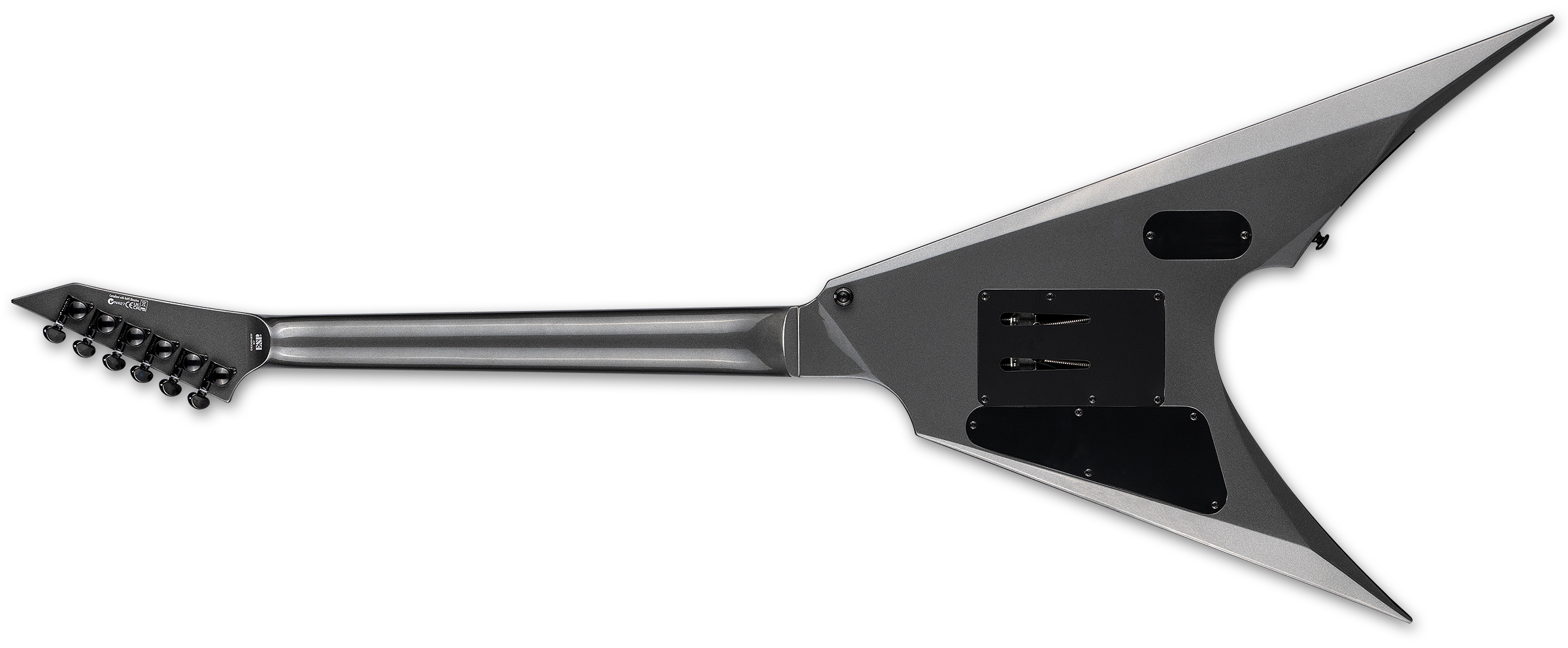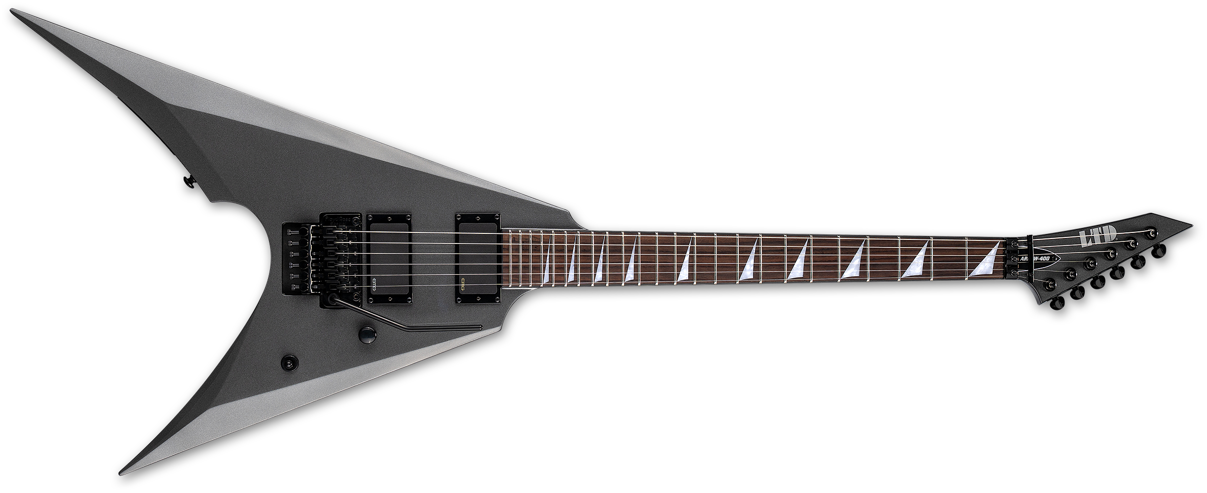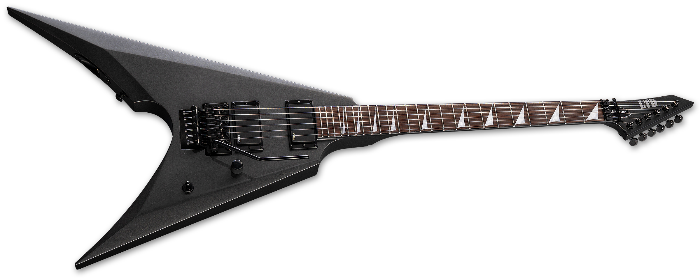 The LTD Arrow-400 offers the bold, angular Arrow shape with professional features, components, and build quality while still remaining accessible for most musicians. This guitar offers set-neck construction at 25.5” scale, pairing a fast, extra-thin U-shaped three-piece maple neck with a mahogany body. It offers a rosewood fingerboard with 24 extra-jumbo frets, and black binding on the neck and headstock. Components on the Arrow-400 include a Floyd Rose Special double-locking tremolo bridge, Grover tuners, and the time-tested, aggressive tones from a set of EMG 81 (bridge) and EMG 85 (neck) active pickups.