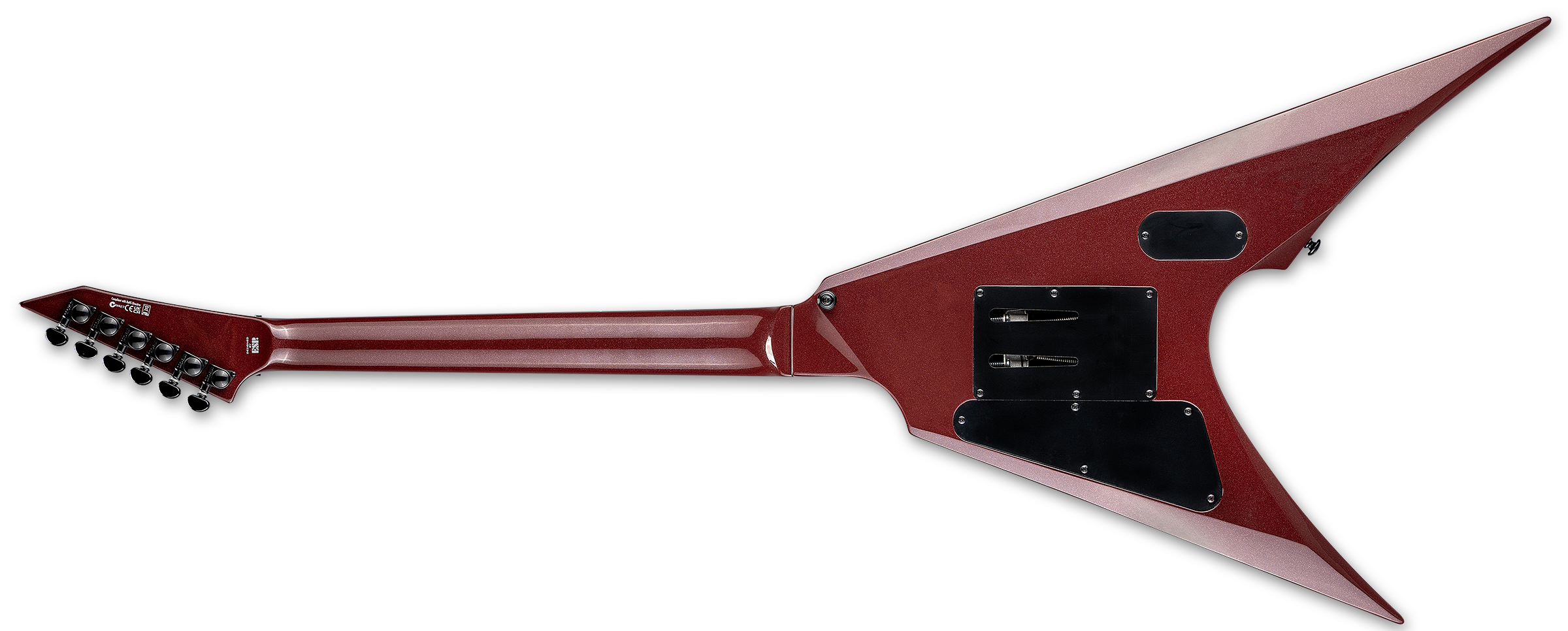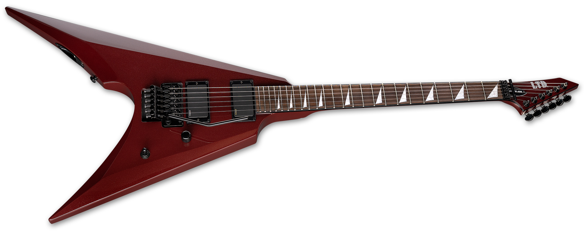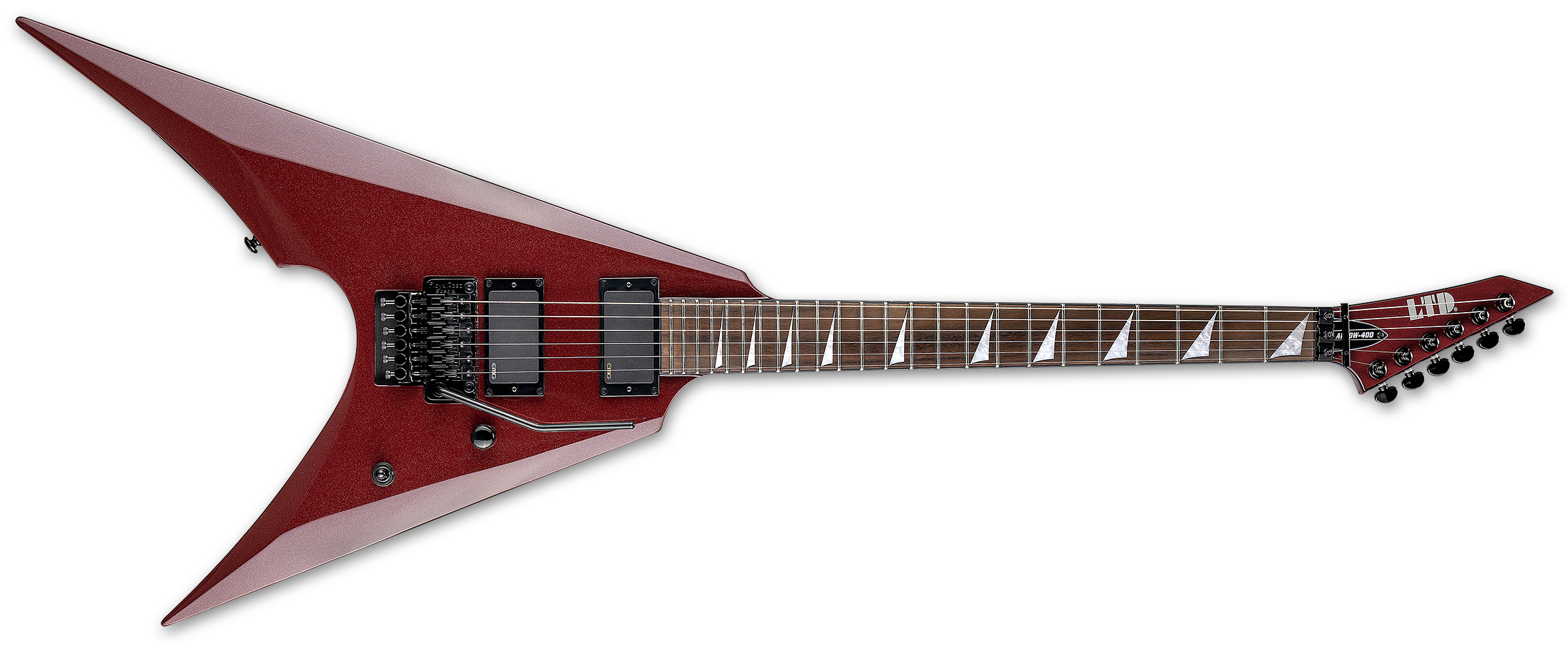 The LTD Arrow-400 offers the bold, angular Arrow shape with professional features, components, and build quality while still remaining accessible for most musicians. This guitar offers set-neck construction at 25.5” scale, pairing a fast, extra-thin U-shaped three-piece maple neck with a mahogany body. It offers a rosewood fingerboard with 24 extra-jumbo frets, and black binding on the neck and headstock. Components on the Arrow-400 include a Floyd Rose Special double-locking tremolo bridge, Grover tuners, and the time-tested, aggressive tones from a set of EMG 81 (bridge) and EMG 85 (neck) active pickups.