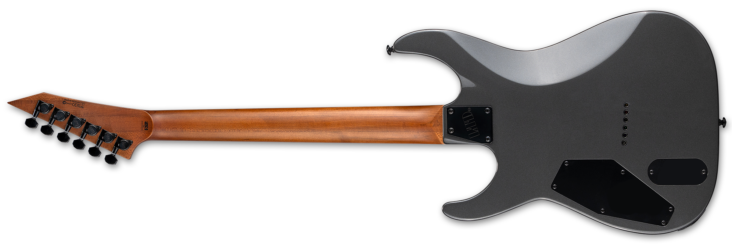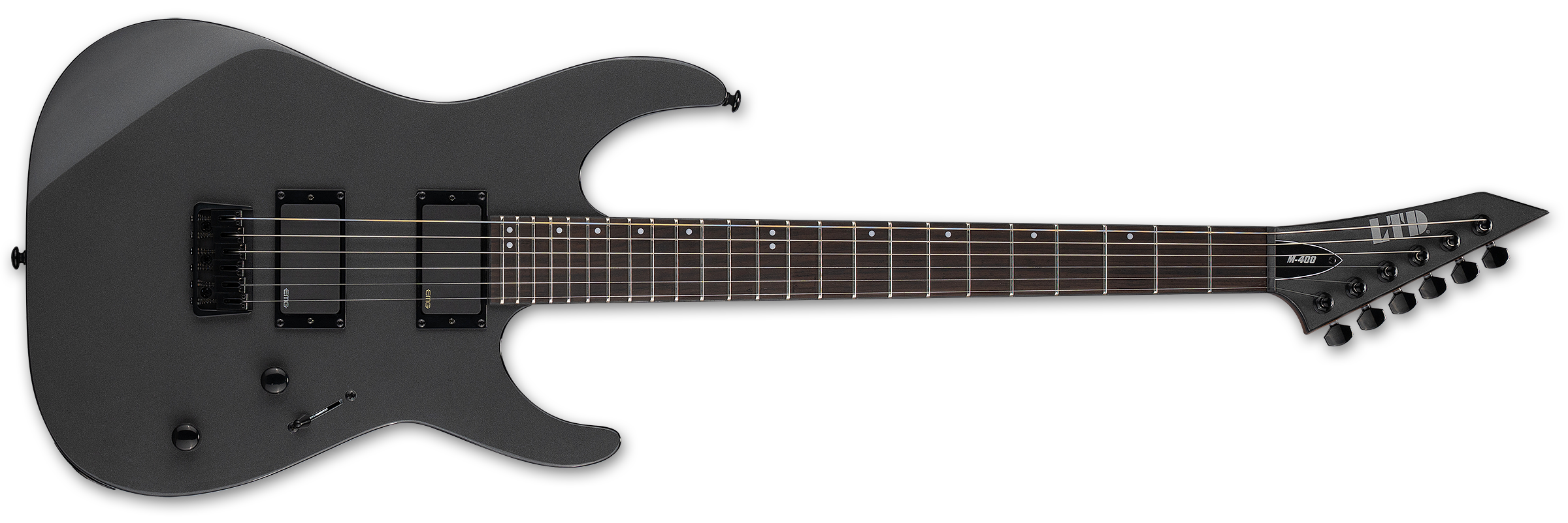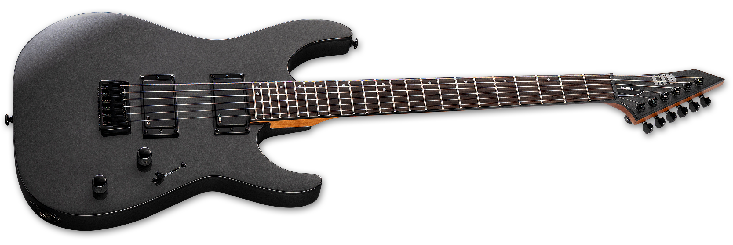 The LTD M-400HT takes the speedy, flat-topped ESP M/Mirage shape and offers it with professional components and build quality at a price that musicians can afford. This guitar is designed for your most brutal chugs and fluid leads, using bolt-on construction at 25.5” scale that pairs a mahogany body to a three-piece roasted maple neck with a reversed matching-finish headstock, rosewood fingerboard, and 24 extra-jumbo frets. Details like black hardware and single-ply black binding help impart this guitar’s tough aesthetic. Components on the M-400HT include LTD locking tuners, and LTD fixed hardtail bridge with string-thru-body, and a set of powerful and aggressive EMG 81 (bridge) and EMG 85 (neck) active pickups.