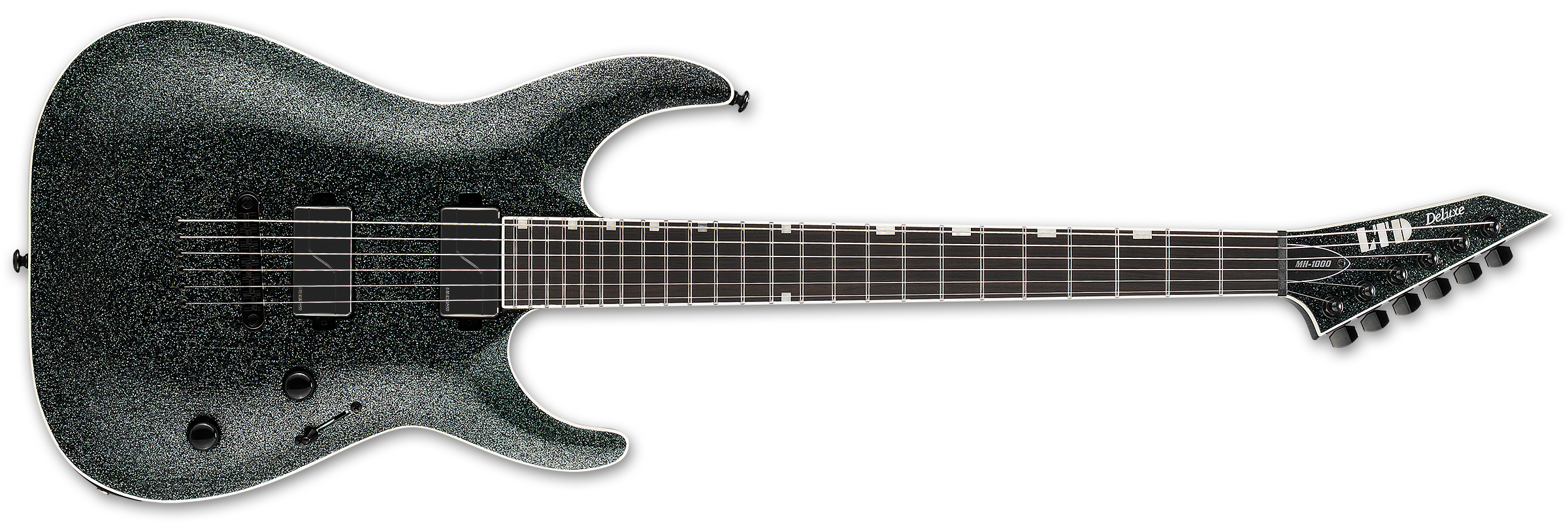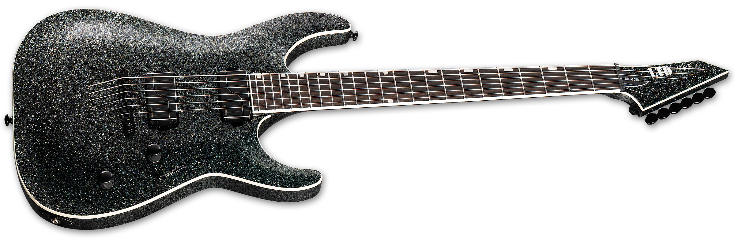 Designed for professional guitar players who require the versatile tones, smooth playability, and complete reliability for serious recording and touring needs, the LTD Deluxe MH-1000NT is a seriously heavy-duty machine for your most high-performance guitar playing. Built with set-thru construction at 25.5” scale, the MH-1000NT offers a mahogany body, a three-piece extra-thin U-shaped maple neck, and a Macassar ebony fingerboard with compound radius, 24 extra-jumbo stainless steel frets, offset block inlays, and a reversed matching-finish headstock. Components on this outstanding guitar include LTD locking tuners, a TonePros locking TOM-style bridge with string-thru-body, and a set of direct-mounted Fishman Fluence Modern 3-Voice Humbucker pickups — ceramic in the bridge, and alnico in the neck — with Black Nickel covers. Push-pull controls allow for selection of these innovative pickups’ multiple voices.