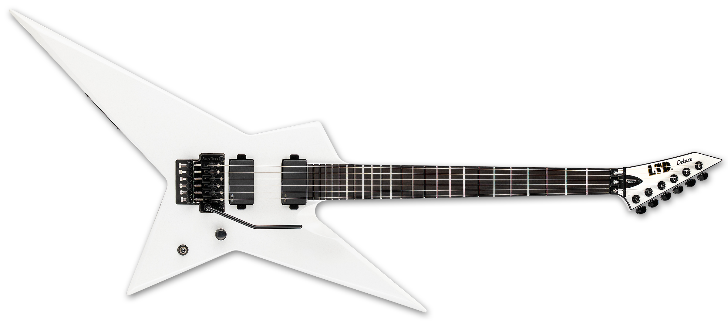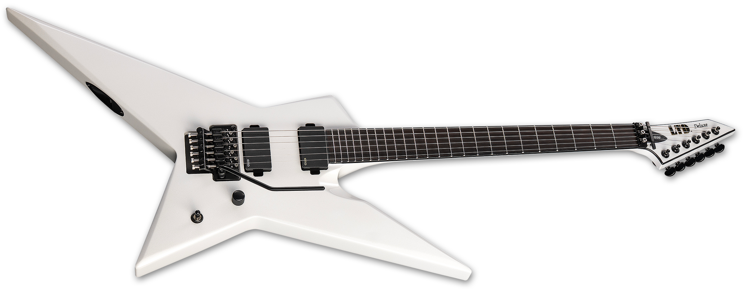 The LTD Deluxe RS-1000 offers ESP’s immediately-noticeable Random Star shape in a guitar designed for professional players who require the versatile tones, smooth playability, and complete reliability for serious recording and touring needs. Finished in gleaming Pearl White. the RS-1000 is packed with everything you need for your most exhilarating performances. That includes neck-thru-body construction at 24.75” scale, with mahogany body wings paired to an extra-thin U-shaped three-piece maple neck that offers a Macassar ebony fingerboard, 24 extra-jumbo stainless steel frets, and a reverse headstock with matching finish. Components on this metal machine include a Floyd Rose 1000SE double-locking tremolo with stainless steel screws, precise Grover tuners, and a set of super-aggressive direct-mount EMG 81 (bridge) and EMG 85 (neck) active pickups.