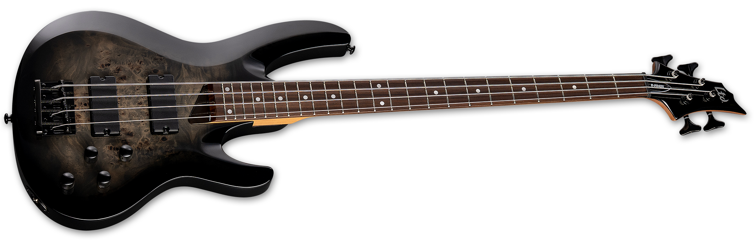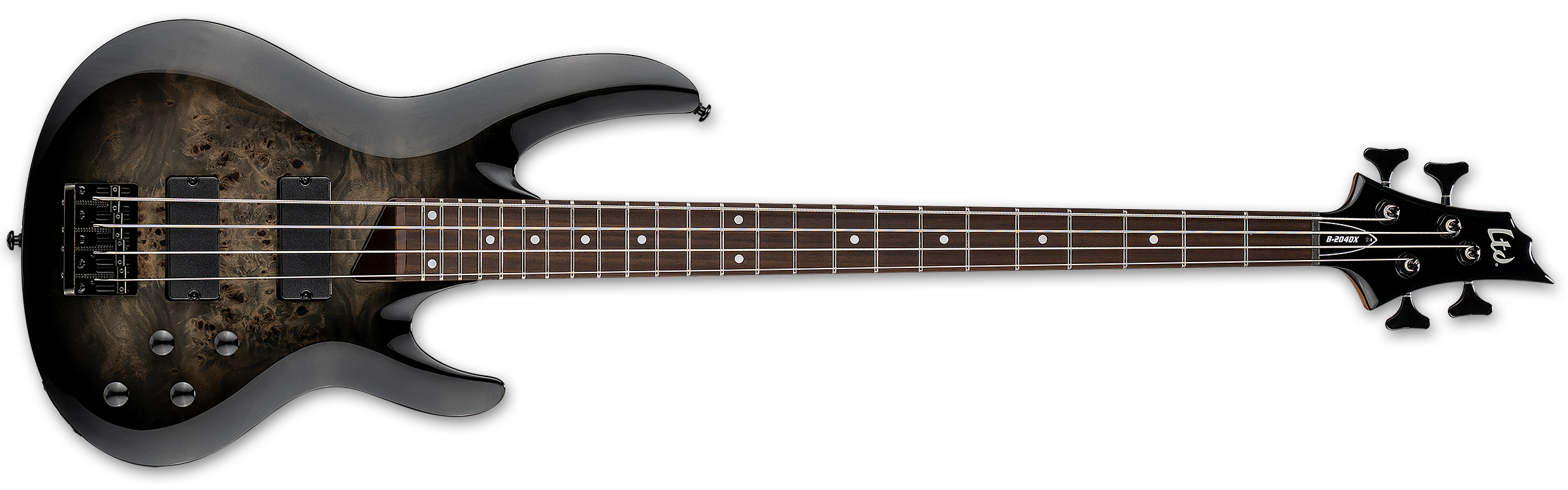 The LTD B-204DX is a bass that delivers far more than anyone would expect, given its modest price. Built with bolt-on construction at 34” scale, the B-204DX offers a poplar body with an outstanding burled poplar top, where the wood’s natural knots and figured grain provide an eye-catching aesthetic. This bass also offers a smooth and comfortable roasted maple neck and a rosewood fingerboard with dot inlays and 24 extra-jumbo frets. Components on the B-204DX include black hardware, LTD tuners, an LTD DB-4 fixed bridge, controls for volume, balance, treble and bass EQ, and a set of excellent ESP SB-4 bridge and neck pickups.