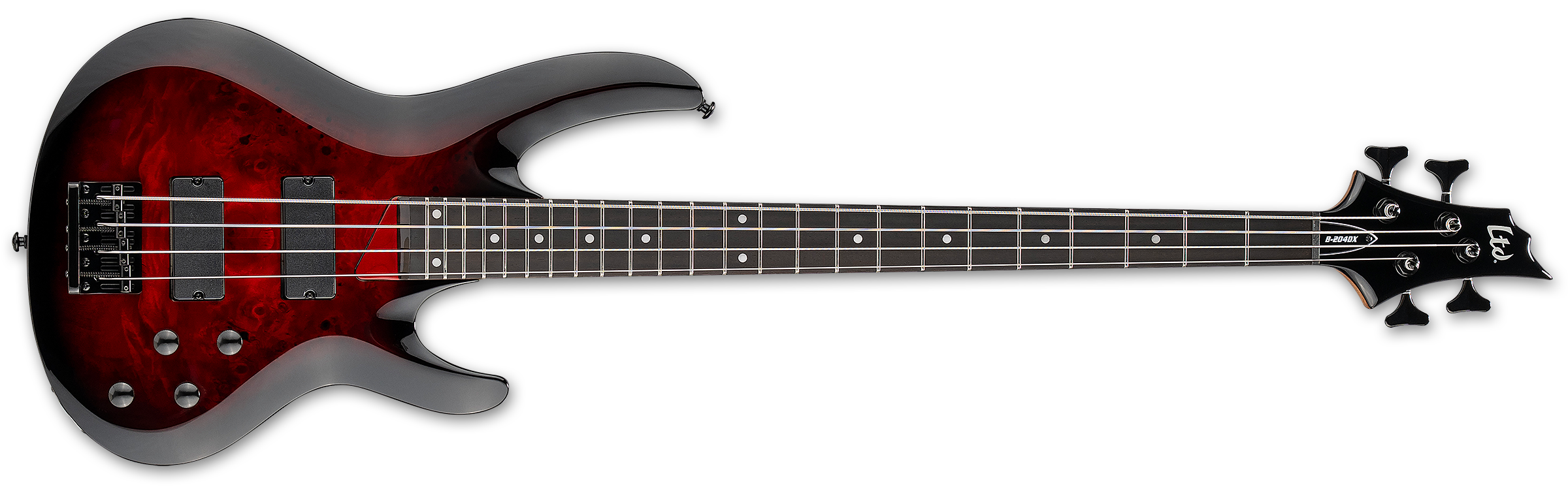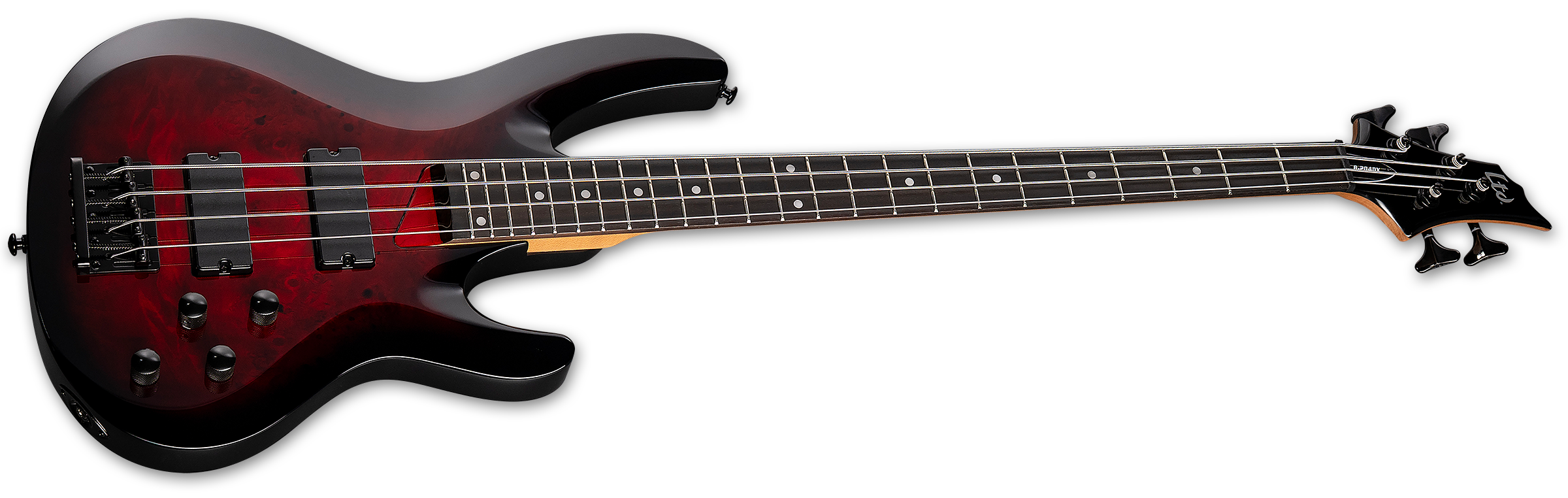 The LTD B-204DX is a bass that delivers far more than anyone would expect, given its modest price. Built with bolt-on construction at 34” scale, the B-204DX offers a poplar body with an outstanding burled poplar top, where the wood’s natural knots and figured grain provide an eye-catching aesthetic. This bass also offers a smooth and comfortable roasted maple neck and a rosewood fingerboard with dot inlays and 24 extra-jumbo frets. Components on the B-204DX include black hardware, LTD tuners, an LTD DB-4 fixed bridge, controls for volume, balance, treble and bass EQ, and a set of excellent ESP SB-4 bridge and neck pickups.