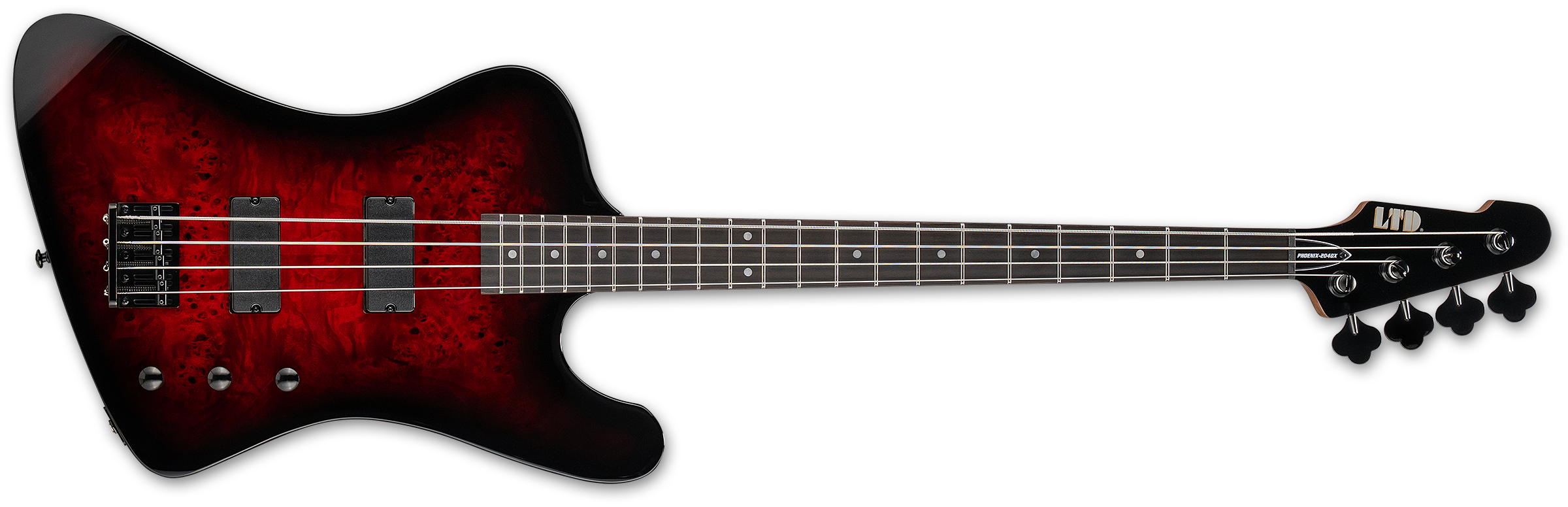 The LTD Phoenix-204DX takes the flowing curves of the Phoenix shape and delivers it in a powerful bass that’s priced to fit the budgets of most musicians. It features bolt-on construction at 34” scale, with a poplar body topped by burled poplar where the natural knots and figured grain offers a terrific aesthetic look. This bass also offers a smooth and comfortable thin U-shaped roasted maple neck and a rosewood fingerboard with dot inlays and 21 extra-jumbo frets, as well as a reverse headstock. Components on the B-204DX include black hardware, LTD vintage tuners, an LTD DB-4 fixed bridge, controls for volume, balance, and tone boost, and a set of excellent ESP SB-4 bridge and neck pickups.