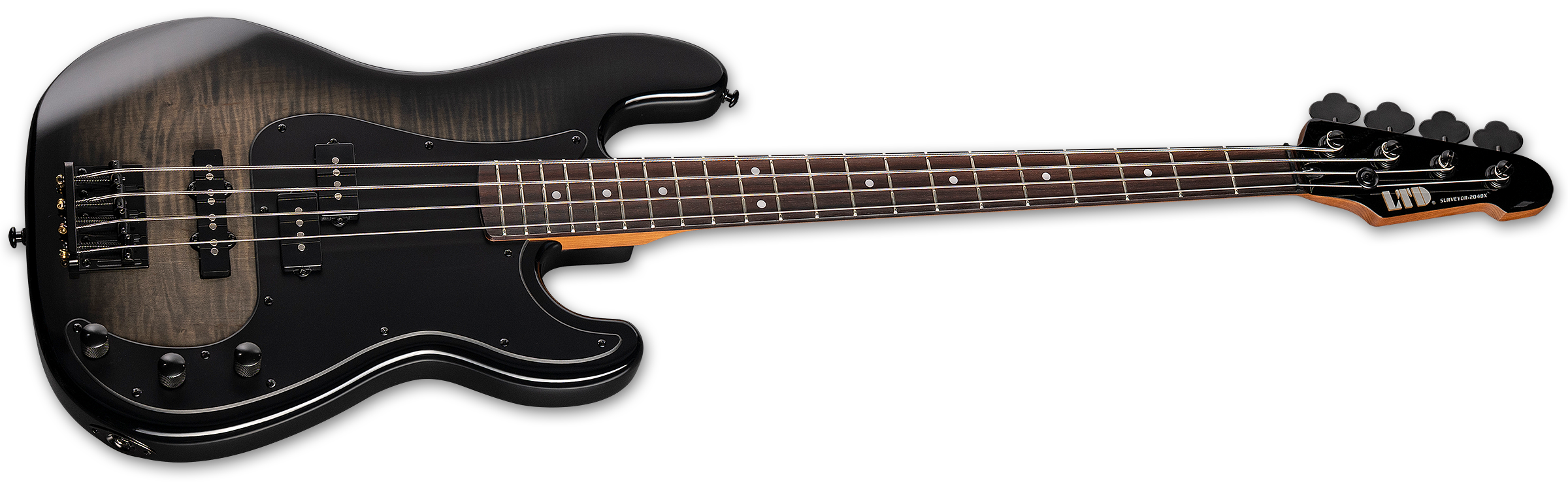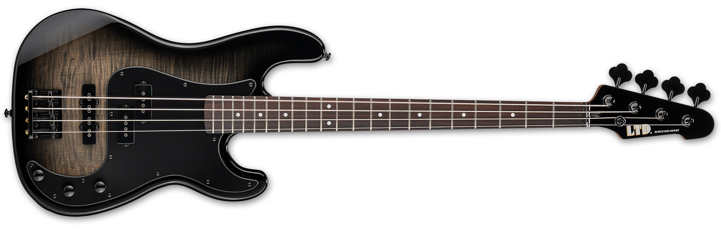 The LTD Surveyor-204DX takes a classic ESP bass shape and offers it with great LTD quality and high value. Built with bolt-on construction at 34” scale, the Surveyor-204DX includes a lightweight, resonant poplar body with a burled poplar top, imparting a superbly unique look with the knots and figured wood grain showing through the transparent finish. It features a smooth and comfortable roasted maple neck with rosewood fingerboard, dot inlays, and 21 extra-jumbo frets. Components on the Surveyor-204DX include black hardware, LTD vintage tuners, an LTD DB-4 fixed bridge, controls for volume, balance, and tone boost, and a set of ESP LJB (bridge) and LPD (neck) pickups.