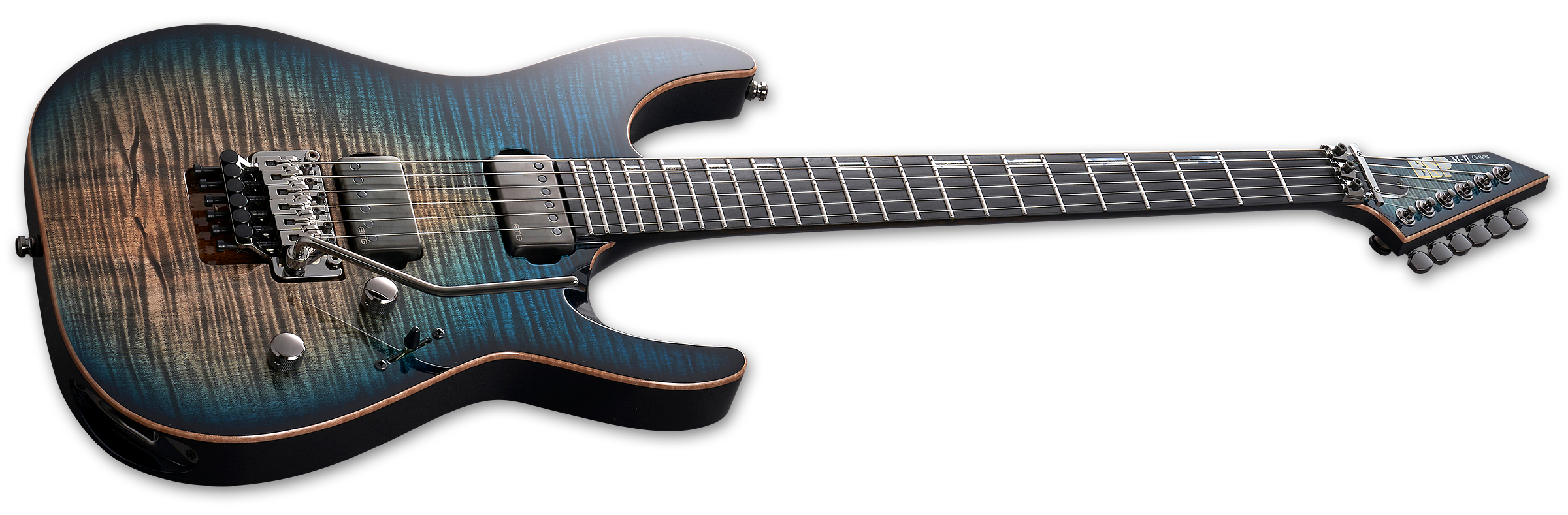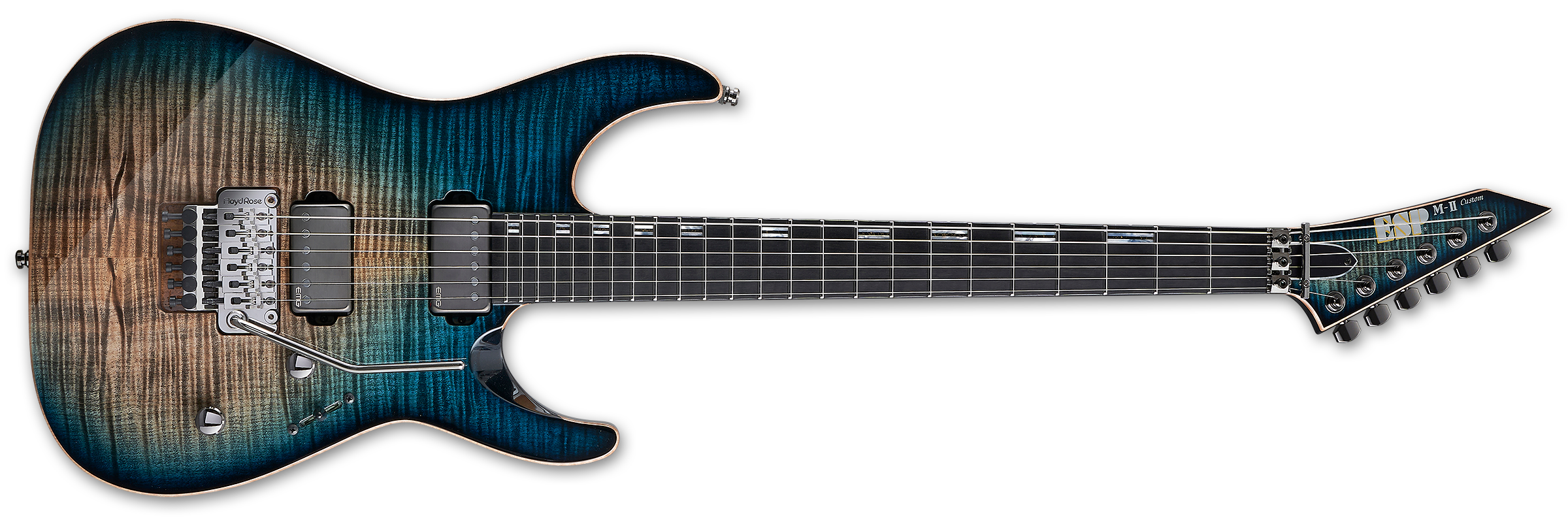All ESP Original Series instruments are hand-crafted, one at a time, by the world-renowned expert luthiers at the ESP Custom Shop in Japan. The ESP M-II CTM FR comes in this luxurious ESP exclusive Black Aqua C-Burst finish over its solid flamed maple top, with natural masked binding on the body and headstock. It’s built with set-thru construction at 25.5” scale, allowing smooth, unfettered access to the highest frets, and pairing an Honduran mahogany body to a three-piece maple neck. Its ebony fingerboard features offset bar inlays, Luminlay side dots, a reverse matching-finish headstock, and 24 extra-jumbo stainless steel frets. Only the finest components are chosen for a guitar of this level of quality, and include black nickel hardware, ESP strap locks, Gotoh locking tuners, a Floyd Rose Original double-locking tremolo bridge, and a set of EMG 57-TW (bridge) and EMG 66-TW (neck) dual mode active pickups with brushed black chrome covers, delivering everything from balanced, creamy smooth tones to aggressive, in-your-face punch, with both pickups switchable to single-coil mode via push-pull control. Includes a deluxe ESP form fit case.